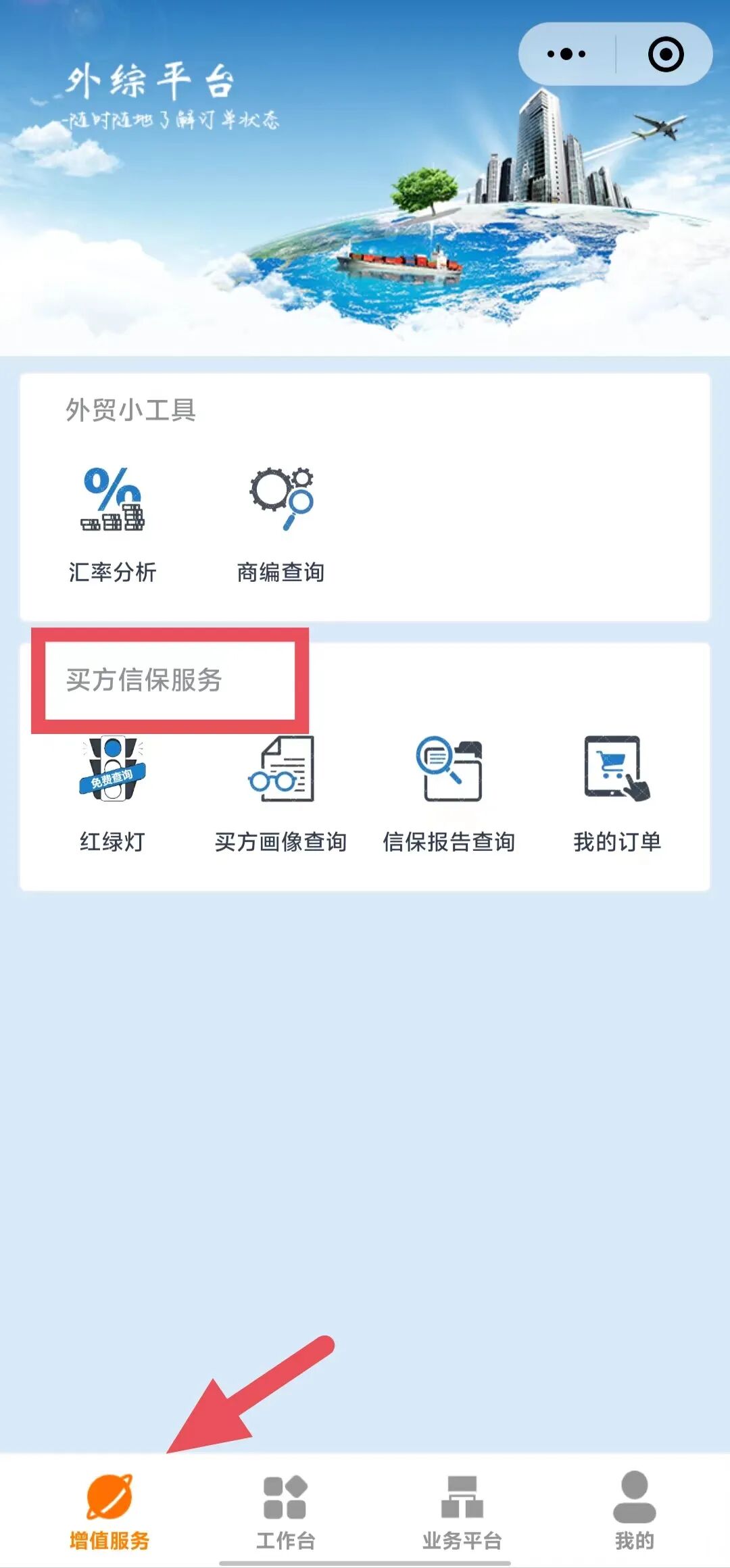 即日起,登录“宏鹏发外综服平台”小程序,点击——增值服务频道——买方信保服务。